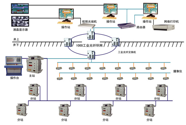 由于输煤流系统分布比较分散,各条皮带前后搭接,在第一条皮带机头设立集中控制装置(主站),作为整个系统的控制核心;同时,在其余每条皮带的机头设立分站控制箱,主站和分站之间通过工业控制总线联网,进行数据交换,传输介质为屏蔽双绞电缆,传输速率为187.5kbit, 传输距离站与站之间(不加中继器)可以达到1200m,如未能达到要求可增加中继箱。监测数据通过以太环网传送到地面集控中心,同时接受地面集控中心发送的控制命令,实现输煤流系统运行的自动化,可接入矿井综合自动化信息平台,实现监控数据与信息的共享。 |