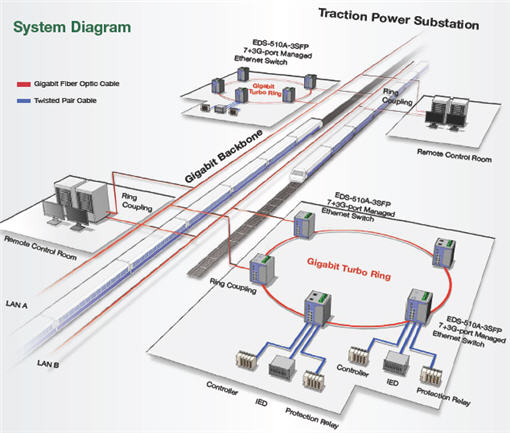 在牵引变电所之间,100台EDS-510A-3SFP以太网交换机构成了数目庞大的冗余通信环路。根据地铁车站的分布位置,还为每一个冗余通信环路分配了不同的虚拟局域网,从而可实现对每个车站段的单独管理。为了将子系统集成到主系统中,每个冗余环配置了两台EDS-510A以太网交换机,并通过环耦合技术连接千兆骨干网上的不同局域网段。EDS-510A系列交换机都支自愈技术,恢复时间少于20ms,从而为电力监控系统提供了随时可用的网络连接,该功能也大大增强了铁路网络电力系统的可靠性。