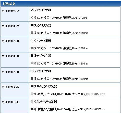 光纤收发器MT8110是一种将以太网电信号转换成光信号或反之的光电转换设备,通过将电信号转换成光信号在多模或单模光纤上传输,突破了电缆传输距离短的限制,使得以太网在保证高带宽传输的前提下,利用光纤介质实现几公里甚至上百公里的远距离传输。支持IEEE802.3以太网标准,IEEE802.3u快速以太网标准,全双工或半双工工作模式。为用户提供光纤以太网长距离传输或底层以太网接入应用