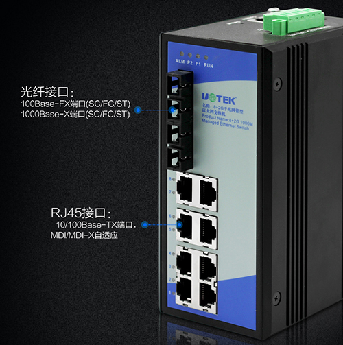 UT-62208F系列交换机支持8个10/100Base-TX端口,MDI/MDI-X自适应电口,可满足系统高带宽数据传输的需求。