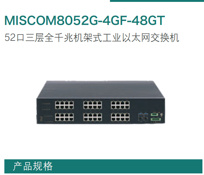 MISCOM8052G三层全千兆工业以太网交换机是武汉迈威专为工业通信领域研发的一款三层高性能以太网通信产品。MISCOM8052G支持支持4个千兆光+48个千兆电接口配置,MISCOM8052G为19英寸机架式安装,支持前面板安装和后面板安装。MISCOM8052G除了支持端口、VLAN、组播、QoS、快速冗余环等丰富的二层软件特性外,还支持静态和动态路由、组播路由,并支持Console、Web多种管理方式以及上位机网管软件,为工业通信提供高性能和高可靠的解决方案。