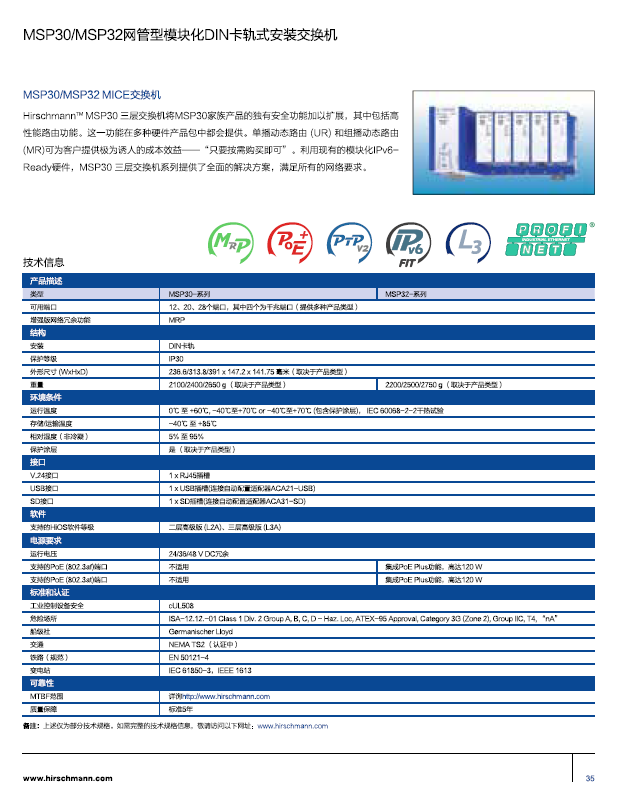 MSP30-X交换机的部分重要功能特点包括:用于实时数据的“精密时间协议2”(Precision Time Protocol version 2),用于网络扩展的L3路由功能,-40˚C至+70˚C的工作温度范围,高达100%的工作相对湿度,以及能够将网络可用性最大化的众多安全功能。此外,它还配备了额外的支架,可将模块安装在设备主机上;并提供了以太网线,这些以太网线可通过M12连接器紧固在模块上。