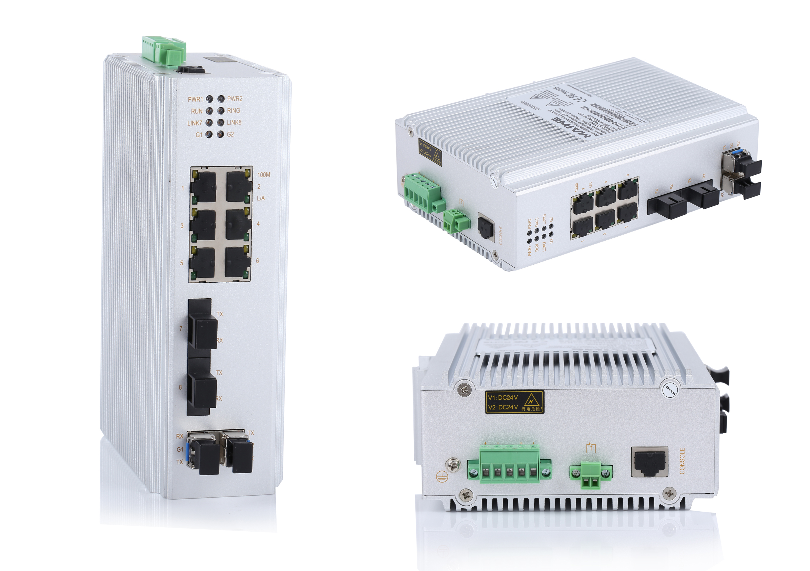 MISCOM7210系列交换机配置2千兆上联接口,8百兆接口光电可选,可实现多种网络管理方式,可实现Mwring、虚拟局域网、Trunk、服务质量 (Quality of Service)、IGMP Snooping、速率控制、端口镜像、静态MAC地址转发表、诊断功能、Email/Relay故障报警和固件在线升级等一系列的高级管理功能。在防护等级方面,采用IP40全封闭合金外壳,可满足EMC-4级标准。
