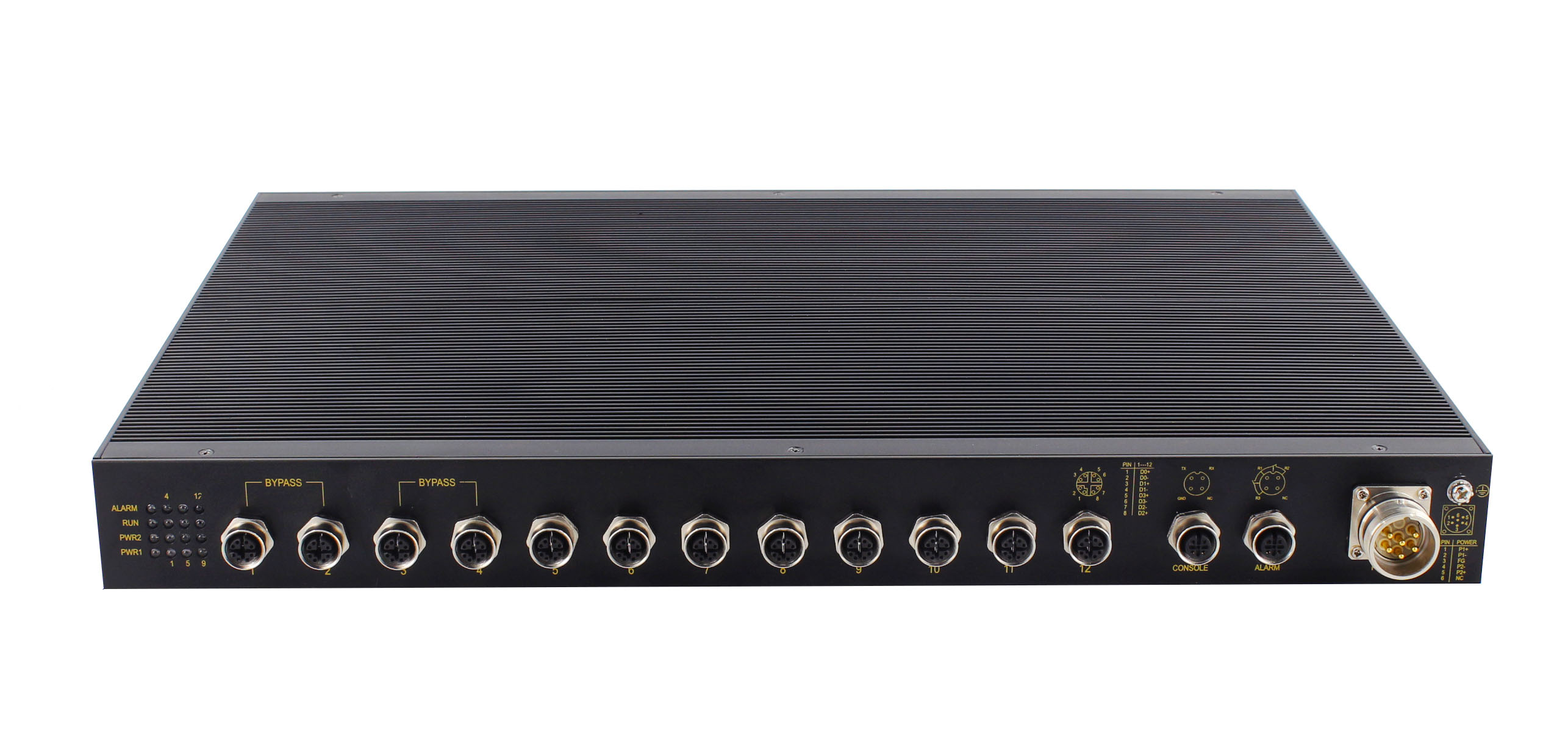 支持12路千兆以太网M12接口,1路M12Console口,1路M12告警接口,1路M23电源接口;
