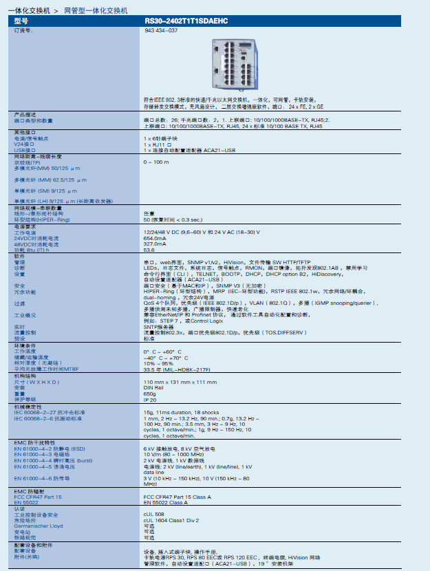 26 port Gigabit/Fast-Ethernet-Switch (2 x Gigabit Ethernet, 24 x Fast Ethernet), managed, software Layer 2 Enhanced, for DIN rail store-and-forward-switching, fanless design