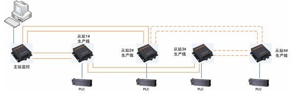 玻璃生产线有4条产线,每一条产线的PLC分别接一台MWF501通过光纤与中控计算机组成环网。