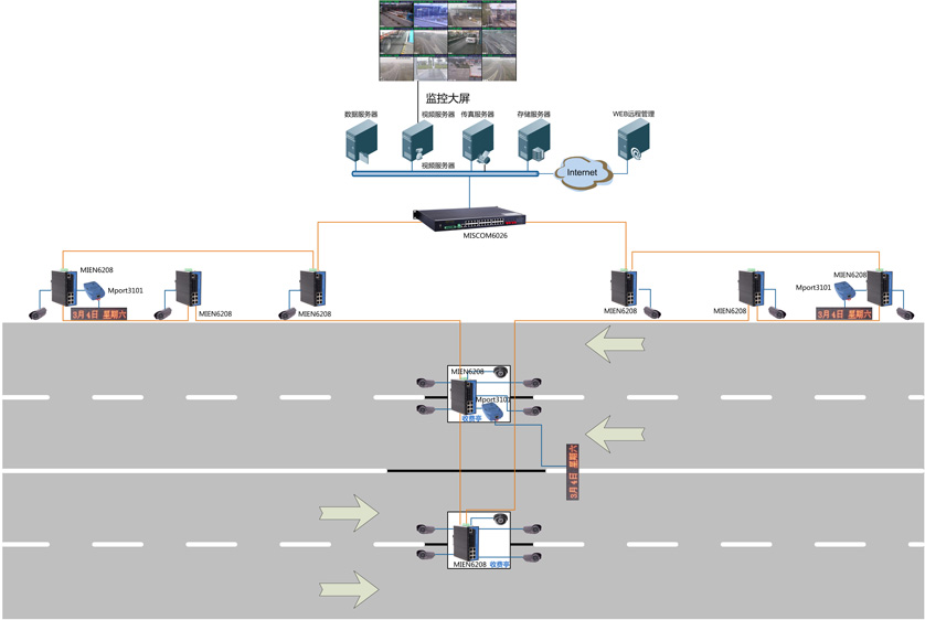 高速公路收费站LED数字屏控制系统串口信号通过串口服务器Mport3101接入到整个网络中,有2个自动彩转黑的智能高速球摄像机在公路两个方向作环境监控,每个车道的两个方向上均有两个摄像机进行监控和拍照,然后在高速路的两旁每隔500米就有一个监控摄像头,对过往车辆进行记录,视频信号采用数字压缩,编码后按TCP/IP协议打包通过MIEN6208产品接入到整个监控环网,监控中心可对各收费站进行实时/准实时监控,发生警情时联动相应的摄像机进行录像。