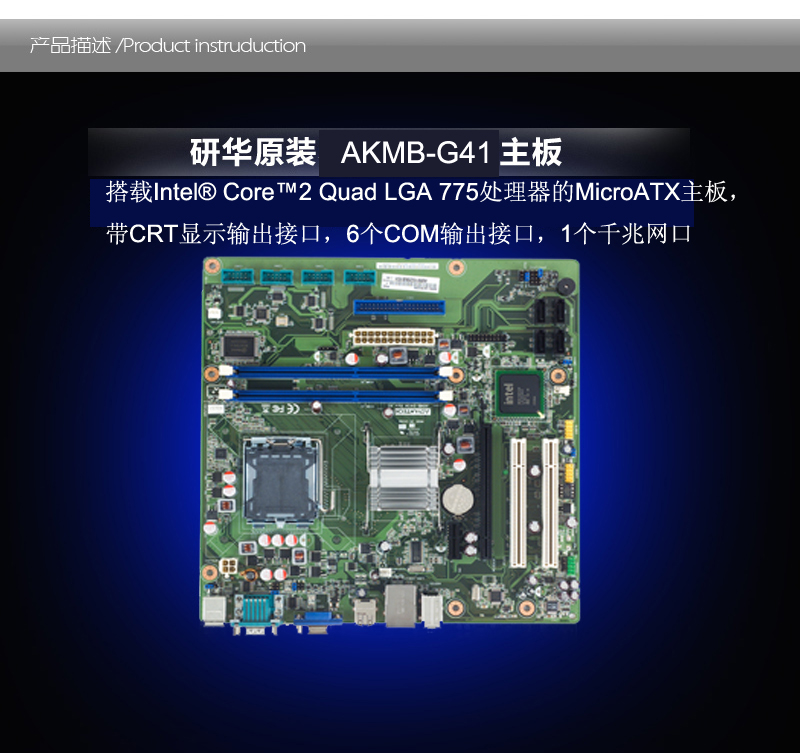 搭载Intel® Core™2 Quad LGA 775处理器的MicroATX主板,带CRT显示输出接口,6个COM输出接口,1个千兆网口          搭载Intel® G41芯片组,支持800/1066MHz的前端总线          双通道内存插槽,最大支持4GB 800/1066 DDR3内存          支持CRT单显输出          支持45纳米制造工艺的双核和四核处理器