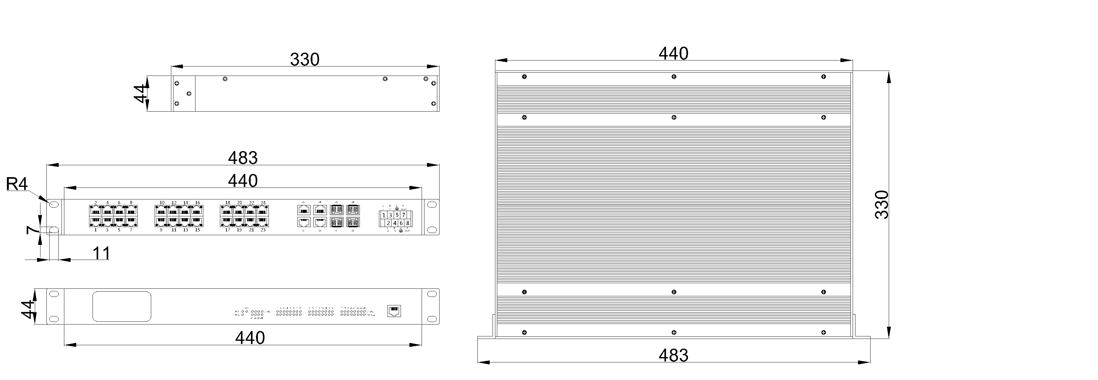 标准19英寸机架式安装,483mm×44mm×330mm,支持前后出线安装