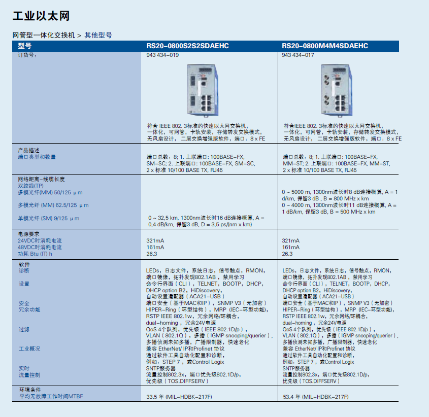 产品描述:赫斯曼交换机RS20-0800S2S2SDAEHC是符合ieee 802. 3标准的快速以太网交换机,一体化,非网管,卡轨安装,存储转发交换模式,无风扇设计,端口: 8 x fe
