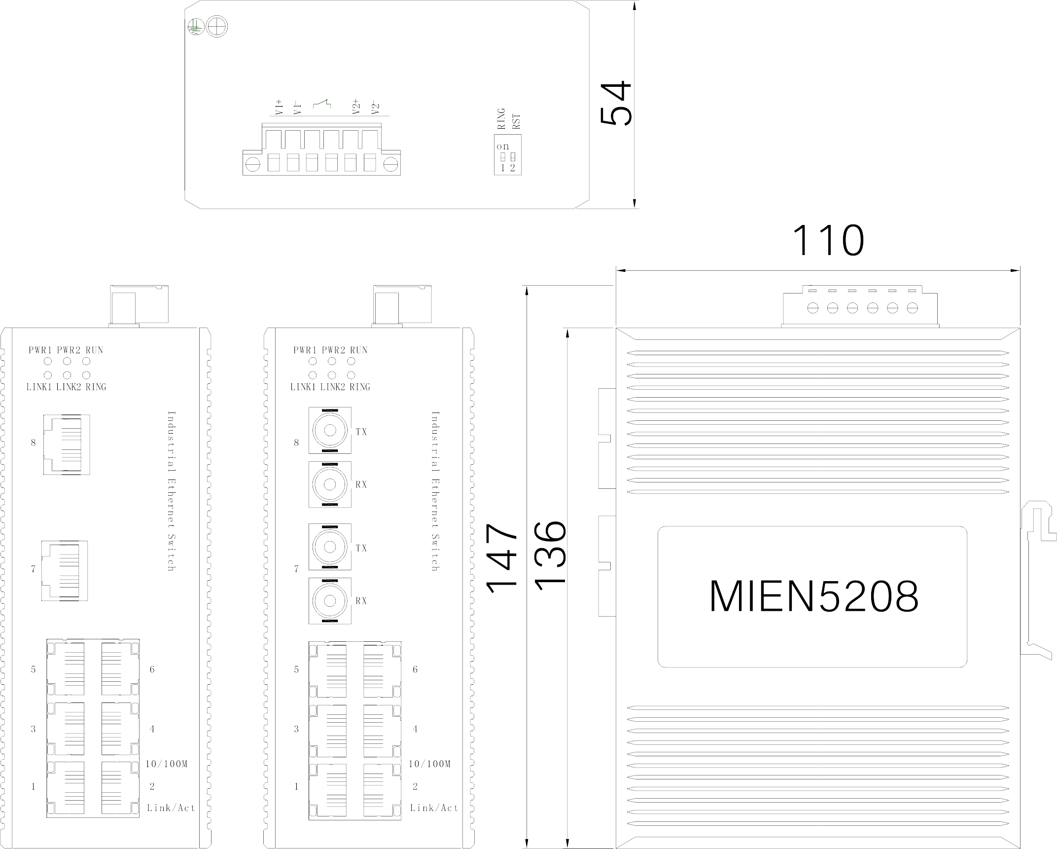 | 例如:MIEN5208-2S-SC20:2个百兆单模SC光口,传输距离20km,6个百兆电口,标配直流双输入电源DC12~48V |
