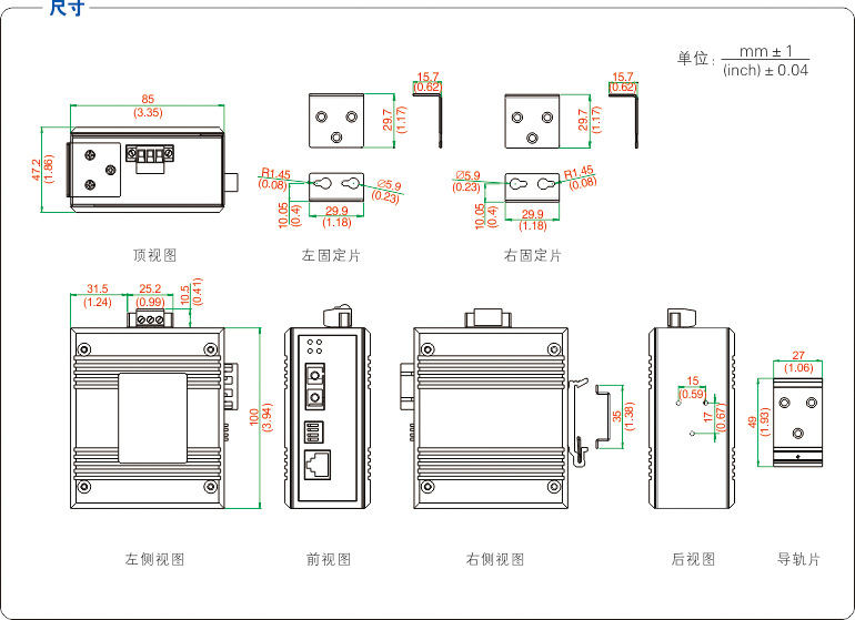 备注: 1、以上产品的光口类型默认为SC接口,另可选ST/FC接口,更多配置可咨询市场部。 2、产品的后缀“220“表示为电源110/220VAC/DC(88~264VAC/DC)输入。 协议标准 IEEE 802.3 IEEE 802.3u 接口 光纤接口:1路100Base-FX端口 RJ45接口:1路10/100Base-T(X)端口,MDI/MDI-X自适应 传输距离 超五类双绞线:100m 光纤 单模:1310nm 20/40/60Km 1550nm 80/100/120Km 多模:1310nm 2Km 交换性能 转发速率:148810pps 传输模式:存储转发 MAC地址缓存:1K 交换带宽:400M 电源需求 输入电压:110/220V AC(88~264VAC)/50-60Hz or 110/220VDC(88~264VDC) 功耗 空载:3.2 W@220VAC 满负载:4.3 W@220VAC 机械特性 外壳:IP40防护安装 重量: 560g 安装方式:导轨式安装\壁挂式安装 机械尺寸 尺寸(W×H×D): 100mm×47.2mm×85mm 工作环境 工作温度:-40℃~85℃ 存储温度:-40℃~85℃ 相对湿度:0~95%(无凝露) 行业标准 EMI:FCC Part 15,CISPR (EN55022) class A EMS: IEC(EN)61000-4-2(ESD) IEC(EN)61000-4-3(RS) IEC(EN)61000-4-4(EFT) IEC(EN)61000-4-5(Surge) IEC(EN)61000-4-6(CS) IEC 60068-2-27(Shock) IEC 60068-2-32(Freefall) 保修期:5年