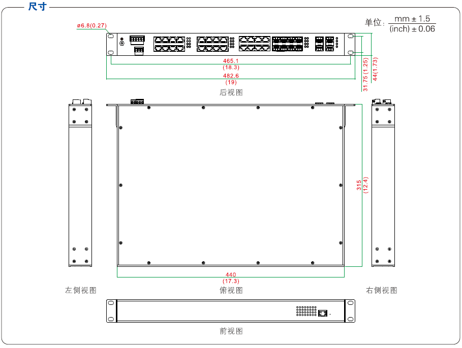 规格参数 协议标准 标准:IEEE802.3、IEEE802.3u、IEEE802.3x、IEEE802.3z、 IEEE802.3ab、IEEE802.1Q、IEEE802.1p、IEEE802.1D、 IEEE802.1W、IEEE802.1s、IEEE802.3ad、 IEEE802.1x、IEEE802.3ae 协议:ARP、ICMP、TCP、HTTP/HTTPS 、Telnet、 STP/RSTP/MSTP、LLDP、IGMP、SNMPv1/v2c/v3, DHCP Server、NTP、SSH、IPV6、LACP、VLAN 三层交换技术:静态路由、RIP V1/V2、OSPF、VRRP支持路由器冗余 流控:IEEE802.3x 流控、背压式流控 接口 光纤接口:100/1000BaseX,SFP(接口) 1G/10Gbps SFP+(万兆SFP口) RJ45接口:10/100/1000Base-T(X)端口,MDI/MDI-X自适应 Console口:串口调试(RJ45接口) 告警端口:3PIN接线端子,继电器告警信息输出 传输距离 超五类双绞线:100m 光纤模块 单模:1310nm 20/40/60Km 1550nm 80/100/120Km 多模:1310nm 2Km 交换性能 百兆转发速率:148810pps 千兆转发速率:1488100pps 万兆转发速率:14881000pps 传输模式:存储转发 MAC地址缓存:16K MAC缓存大小:12M 主机单播路由表:1024(IPV4),512(IPV6) 网段单播路由表:512(IPV4/IPV6) 背板带宽:128G 电源需求 输入电压:110/220VAC(88~264VAC)/50-60Hz or 110/220VDC(88~264VDC) 本设备选用单电源输入,可选双电源冗余输入 功耗 UT-63424G-16GP8GB-4XGP-BNA: 空载功率:14.5W 满载功率:39W(Combo口为光口) UT-63424G-16GT8GB-4XGP-BNA: 空载功率:10.3W 满载功率:24W(Combo口为光口) 机械特性 外壳:IP40防护安装 重量:3.5kg 安装方式:机架式安装 机械尺寸 尺寸(W×H×D): 440mm×44mm×315mm 工作环境 工作温度:-40℃ ~75℃ 存储温度:-40℃ ~85℃ 相对湿度:0~95%(无凝露) 行业标准 EMI:FCC Part 15,CISPR (EN55022) class A EMS: IEC(EN)61000-4-2(ESD) IEC(EN)61000-4-3(RS) IEC(EN)61000-4-4(EFT) IEC(EN)61000-4-5(Surge) IEC(EN)61000-4-6(CS) IEC(EN)61000-4-8 IEC 60068-2-27(Shock) IEC 60068-2-32(Freefall) 保修期:5年