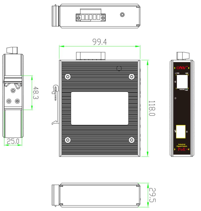 非管理5个10/100/1000M RJ45端口+ 1个1000M 上联SFP光口插槽,工业POE光纤交换机,其中1-4口支持IEEE 802.3af/at PoE国际标准,支持双DC冗余电源输入(凤凰端子连接),支持导轨式安装。