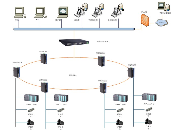 系统核心层选用迈威MISCOM7028千兆网管型交换机,利用迈威MIEN6208网管型卡轨式工业以太网交换机构筑环网进行链路备份,连接石化炼油厂每一处节点,环网上的任意一路光纤通道故障,都不会影响到整个环网的通信,确保通信畅通。