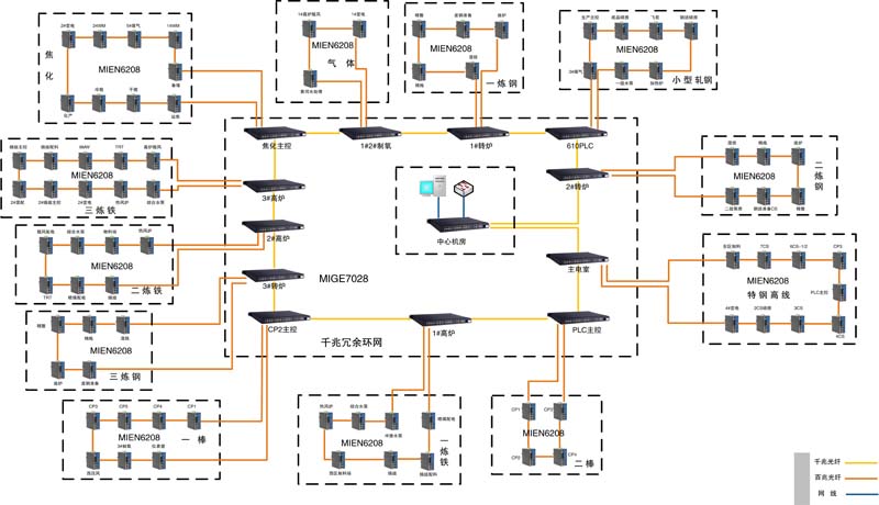迈威采用千兆工业以太网交换机构筑工业MES系统中各车间汇聚点之间的核心网络,在生产网规划中心设多个主汇聚点,采用MISCOM7028系列千兆工业以太网交换机进行组网;拓扑结构采用环网冗余方式进行链路备份,千兆环网上的任意一路光纤通道故障,都不会影响到整个千兆环网的通信;MISCOM7028千兆电口连接MES服务器,百兆光口和车间内部各个站点MIEN6208百兆光口组环;在车间内部通过MIEN6208系列百兆工业以太网交换机构筑环网,针对石横特钢的站点进行合理的分布,通过VLAN虚拟局域网技术对各个车间之间的数据进行逻辑上隔离,保证通信的安全性。