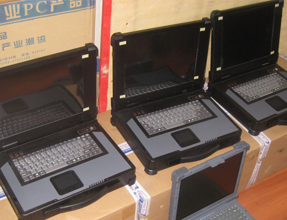 上翻式便携工控机 嵌入式工业主板 提供2个半长的扩充槽 15"高亮度LCD显示屏,分辨率:1024X768 88键键盘、触摸板