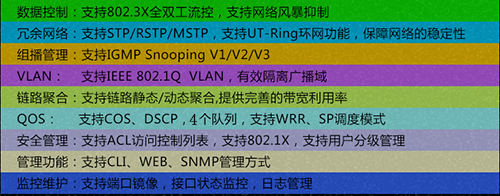 产品交换带宽高达5.6G;产品的转发速率,百兆网络接口可达到148810pps,千兆网络接口可达到1488095pps,大带宽高速率传输,通信更通畅。