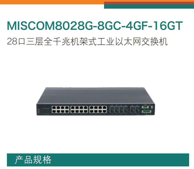 MISCOM8028G三层全千兆工业以太网交换机是武汉迈威专为工业通信领域研发的一款三层高性能以太网通信产品。MISCOM8028G支持8个千兆光电复用+4个千兆光+16个千兆电接口配置,MISCOM8028G为19英寸机架式安装,支持前面板安装和后面板安装。MISCOM8028G除支持端口、VLAN、组播、QoS、快速冗余环等丰富的二层软件特性外,还支持静态和动态路由、组播路由,并支持Console、Web多种管理方式以及上位机网管软件,为工业通信提供高性能和高可靠的解决方案。