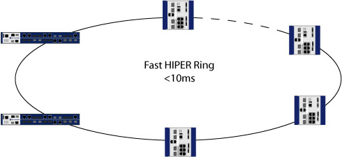支持Fast HIPER-Ring的网管型交换机连接成一个环网,为避免网络中的回路,将一台交换机设为冗余管理者。这台管理交换机以1毫秒为间隔发出测试帧,如果有三个连续的帧未返回,则备用链路在10毫秒内被启动。