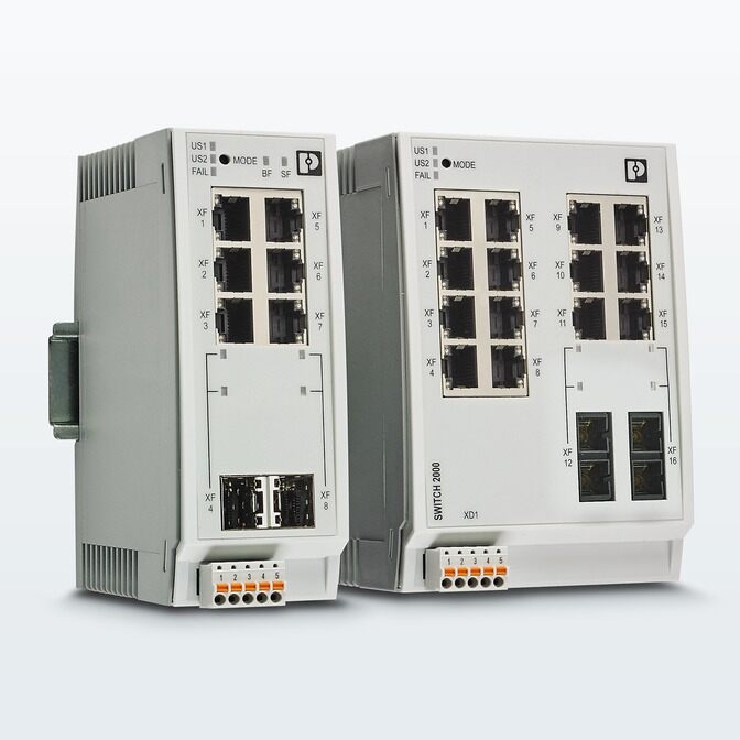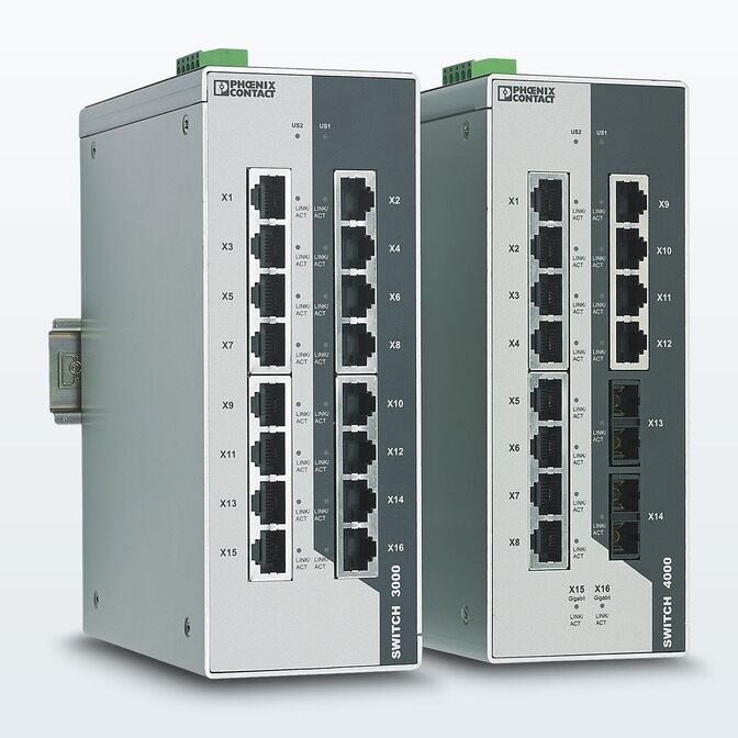 菲尼克斯电气提供多种管理型交换机。它们具有优异的实时性能,可优化数据通信,并支持网络诊断和冗余功能。坚固耐用的DIN导轨式交换机满足特定的工业环境要求,并支持PROFINET、EtherNet/IP™等自动化协议。千兆交换机不仅支持大数据容量,还提供支持以太网供电的型号。 我们提供5到24端口,支持铜缆或光纤接口(SC、ST/BFOC、SFP)并通过多种认证的交换机。