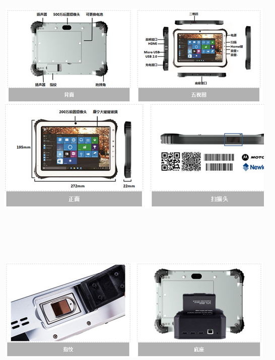 丰富配件,武装出更专业的设备 增加背夹手托设计,跟舒适的持握手感,防止意外跌落。平板底部有磁吸直插触电,可与键盘或可充电底座配合使用,全方位接口支持(RJ45,扩展三个USB口)即插可用。预留笔槽设计,支持电容手写笔,满足用户对绘画、文字批注的使用需求。