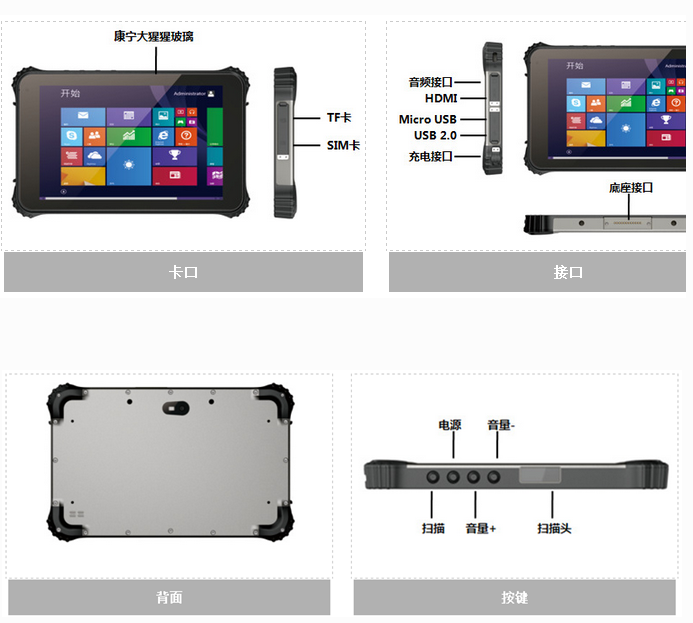 丰富配件 武装出更专业的设备 增加背夹手托设计,跟舒适的持握手感,防止意外跌落。平板底部有磁吸直插触电,可与键盘或可充电底座配合使用,全方位接口支持(RJ45,扩展三个USB口)即插可用。预留笔槽设计,支持电容手写笔,满足用户对绘画、文字批注的使用需求。 百炼千锤 严格测试缔造可靠性能 Gec-80D通过了一系列非常严格的测试实验,包括高低温测试、按键寿命测试、表面耐磨测试、接口插拔测试、震动测试、扭转测试、跌落测试等,百炼千锤缔造可靠性能。