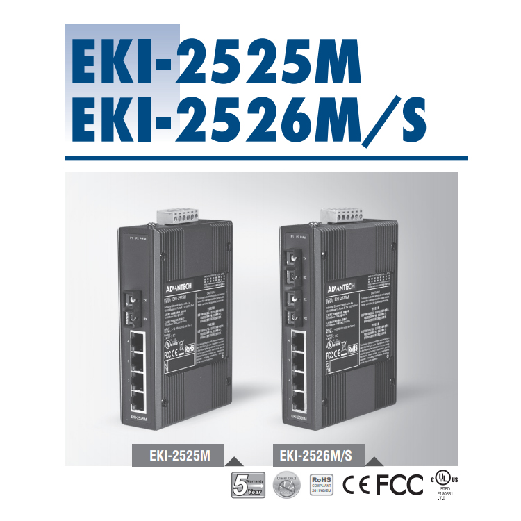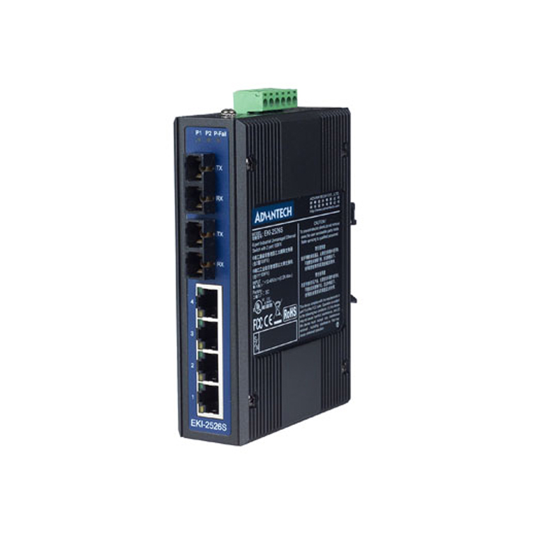 EKI-2526M/S工业极以太网交换机,可帮助您快速、经济地扩展工业网络。EKI-2526M/S有4个10/100 Mbps以太网端口,并附加有2个多模/单模光纤端口。使用光纤端口可以防止端口噪声与信号衰减,并且可以拥有100 Mbps的传输速率与最大2000米的传输距离。EKI-2526M/S工业级设计,能够确保在苛刻的工业环境中设备的可靠性与稳定性,搭建出企业光纤骨干网与以太网设备之间的坚固连接。EKI-2526M/S包含的交换控制器能够自适应100 Mbps的传播速度,并且RJ45接口也可以自动检测,能够自动识别MDI/MDI-X线缆类型,因此不需要用交叉网线进行连接。设备所有的以太网端口都有自己的缓存器,支持存储转发机制,确保所有传输数据的完善与可靠。