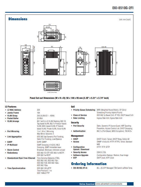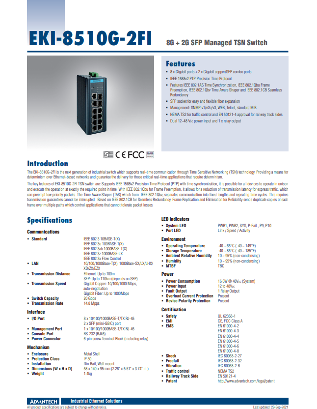 The EKI-8510G-2FI is the next generation of industrial switch which supports real-time communication through Time Sensitive Networking (TSN) technology. Providing a means for determinism over Ethernet-based networks and guarantee the delivery for those critical real-time applications.
