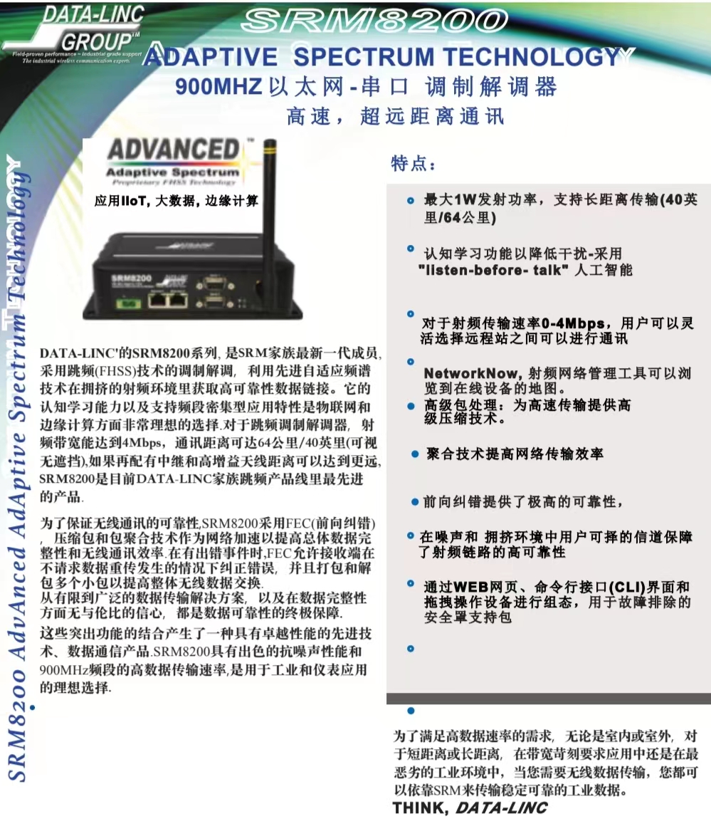 DATA-LINC SRM 系列的最新成员采用与其前身相同的强大且可靠的跳频扩频 (FHSS) 技术,并增加了一项引人注目的新功能:自适应频谱技术。这使得 SRM8200 即使在射频拥塞的环境中也能以极高的速度获得稳定的链路,而不会牺牲范围和可靠性。Adaptive Spectrum 采用高效的“认知学习”,从而能够支持频段密集型应用,是工业物联网和互联企业发展的理想选择。RF 速度高达 4Mbps,这是 FHSS 产品的重大进步,并且使用 LOS(视距)和全向天线时的距离可达 35+ 英里/52+ 公里,使用中继器和全向天线时,它可以大大超出该范围。 /或高增益天线。 为了确保数据完整性,SRM8200 使用 ARQ(自动重复请求)技术和 FEC(前向纠错)。如果检测到错误,ARQ 会请求重新发送数据包,但与 ARQ 一起响应错误时,FEC(一种信号处理数字技术)会在数据传输之前插入冗余数据,称为纠错码或存储。这种双重作用使 SRM8200 能够进行纠错,而无需反向通道来请求数据重传。因此,FEC(也称为信道编码)为传输的信息添加了冗余。结果?终极的数据可靠性,涵盖从有限到广泛的数据传输解决方案,以及对数据完整性的无与伦比的信心。 这些杰出功能的结合产生了具有卓越性能的先进技术数据通信产品。其出色的抗噪声能力和 900 MHz 频段的高数据传输速率使 SRM8200 成为工业自动化和仪器仪表应用的理想解决方案。 为了满足高数据速率需求,无论是室内还是室外、短距离还是长距离,您都可以依靠 SRM8200 在带宽挑战和最恶劣的工业环境中可靠地传输数据。对于工业通信的速度和范围