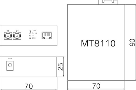 例如:MT8110-S-SC25: 1个百兆单模SC光口,传输距离25km,1个百兆电口,单电源DC5V