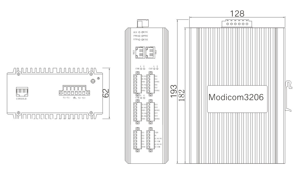 1路百兆光+1路10/100M以太网电口+2路CAN+2路RS232/485串口+ 4路AI+5路DI+2路DO,DC12V供电
