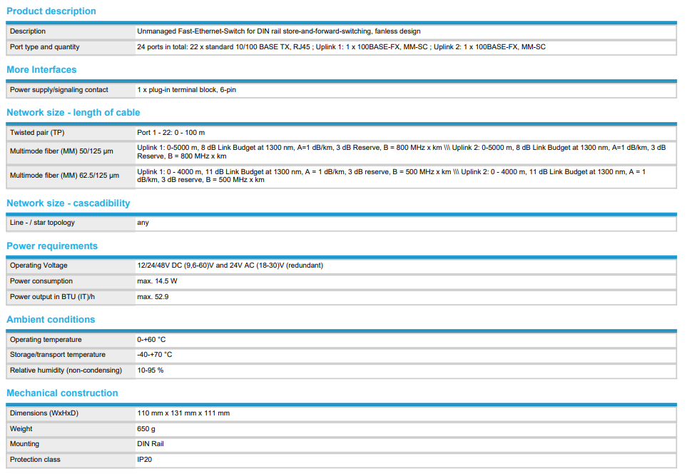 是符合ieee 802. 3标准的快速以太网交换机,一体化,非网管,卡轨安装,存储转发交换模式,无风扇设计,端口: 24 x fe
